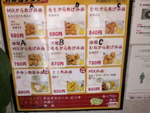 から揚げ弁当はもちろん、南蛮弁当やメンチカツ弁当などもあります。
