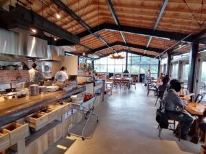 店内にはショップやカフェがあり、建物の裏側には牧場を見渡せる広場やベンチがあります。