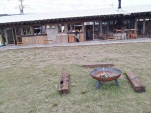 店舗の裏側には薪で楽しむ焚火台やベンチ、芝生の広場があります。
